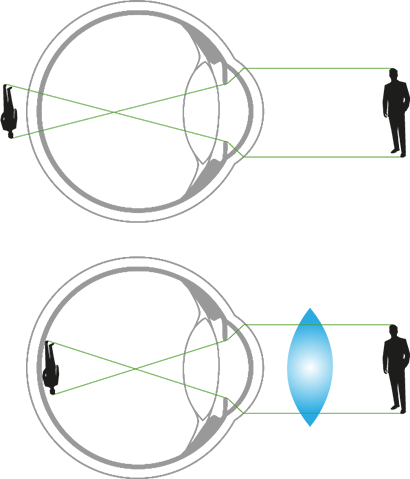 These aspects bring images into focus behind the retina and not directly on it, making it difficult to see close objects. Hyperopia or far-sightedness is corrected with a converging lens, which brings the image into focus on top of the retina, which helps us see well without overstraining