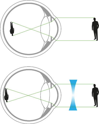 Aceste aspecte aduc imaginile în foc în fața retinei și nu direct pe ea, ceea ce face dificilă vizualizarea obiectelor îndepărtate. Micopia sau atenuarea este corectată cu o lentilă divergentă, care pune accentul imaginii pe partea superioară a retinei și, prin urmare, ne ajută să vedem mai bine.